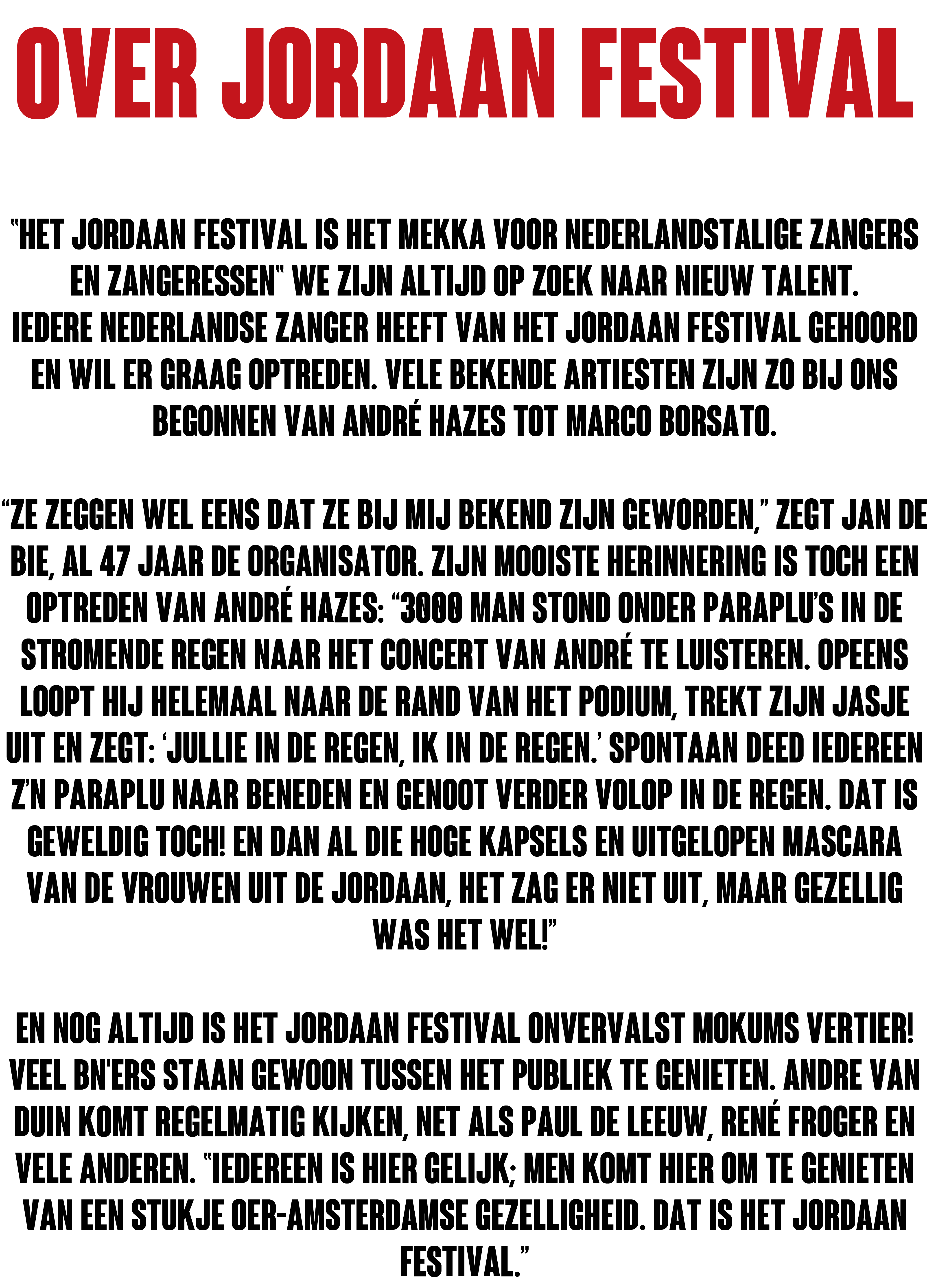U kunt uw vragen mailen naar de organisatie via info@jordaanfestival.nl